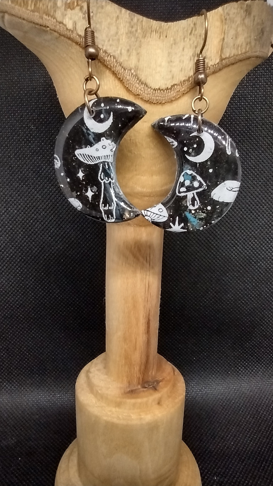 Unique mushroom print against a sparkly galaxy sky. Moon shape with hook dangles.